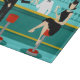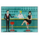 Chaque heure est l'heure heureuse avec ce Retro Cocktail Lounge Cutting Board. Le design moderne du milieu du siècle présente un dessin animé minimaliste et animé de style années 1960 d'un bar à cocktails élégant. Sur fond de mur d'aqua, on peut voir des rangées de verres de boisson. Au moins, on peut voir les silhouettes turquoises des lunettes de boisson. A en juger par les formes de la tige, ce bar est bien équipé pour mouiller votre sifflet, quelle que soit votre préférence de boisson. Un barman des plus compétents et personnalisables est le bar turquoise aux accents jaunes. Le jeune bardonte porte une chemise blanche immaculée avec cravate arc noir. Son apparence fraîche, ses cheveux blonds et ses lunettes noires de hipster nous donnent toutes les raisons de croire qu'il passe ses journées en tant qu'acteur en difficulté ou en tant que super-héros. D'un côté, le beau mixologiste donne un martini à un client de l'autre côté du bar. Le client en attente est un gentleman à larges épaules en costume noir et cravate rouge. C'est le genre de gars qui est décrit comme grand, sombre et beau même quand il reste des heures jusqu'à la fermeture. Il semble y avoir un tabouret rouge et chrome avec le nom de M. Debonair dessus. Mais pour ne pas être présomptueux, il pose la question : "Pardonnez-moi. Est-ce que ce siège est pris ?" Il demande à la fille aux cheveux raven sur le tabouret du bar voisin. C'est une vraie "fille d'à côté", si vous vivez à côté d'une beauté impeccable avec un personnage qui ne démissionnera pas. Elle porte une robe noire et tient un martini d'une main. Elle espère qu'elle et l'homme approchant ont plus en commun que leur préférence pour la boisson et le choix de la couleur de l'armoire. On dirait que ce soir est devenu intéressant. Bravo !