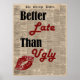 Sassy, confiant et un peu décalé : cette impression "Meilleur en retard que Laid" apporte une énergie glam instantanée à n'importe quel espace. Un fond de journal vintage donne une tonalité rétro, tandis que le noir gras et le rouge à lèvres donnent l'impression d'une note griffée dans le miroir avant une sortie. Une marque de baiser brillante finit le look, ce qui en fait une pièce d'art mural amusante qui mêle l'attitude de la mode au charme nostalgique. Conçu pour les amateurs de beauté et les créateurs de style, ce mur rétro brille dans une salle de coiffure, une salle de poudre, une salle de bain, un dressing, un dortoir ou une boutique. Il s’agit également d’un salon de coiffure parfait pour les coiffeurs, les maquilleurs, les fougères et les studios d’ongles qui veulent un décor avec personnalité. Le papier journal neutre se marie sans effort avec un décor moderne, minimaliste ou vintage, tandis que la palette noire et rouge profond ajoute une pop chic sans heurts. Grande idée cadeau : cadeau d’anniversaire pour votre meilleur ami, proposition de servante d’honneur, gâterie de la Saint-Galentin, surprise de fête de bachelorette, Fête des mères pour la maman glamour, accent chaud au foyer, ou auto-soin pick-me-up pour vous-même. Les amateurs de shopping à la recherche de décors de salon de beauté, d'affiches de citations sassy, de cadeaux d'amoureux du maquillage, d'estampes rétro, de baiser en rouge à lèvres ou encore d'art esthétique des murs de salle de bains seront comblés. Disponible sur les affiches, les imprimés sur toile et plus de formats Zazzle : choisissez la taille et le matériau qui convient à votre espace. Conseil de style : l'associer avec des cadres noirs ou des accents métalliques pour un aspect éditorial, fashion-mag. Ajoutez un humour sûr à vos murs et commencez chaque jour par un clin d'oeil. Ajoutez ceci à votre panier aujourd'hui et laissez votre personnalité guider le chemin ! ( Pour ceux qui achètent la version Téléchargement Instant, s’il vous plaît, envoyez-moi un message si vous souhaitez des tailles supplémentaires pour mieux répondre à vos besoins.)
