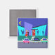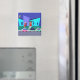 Ce Retro Open House Party Magnet vous mettra dans l'humeur de fête. Le dessin animé présente l'extérieur d'une maison moderne du milieu du siècle. Du sol au plafond, des murs en verre turquoise permettent de voir les silhouettes bleu marine des fêtards. Il y a un couple qui bavarde devant une fenêtre. De l'autre côté de la pièce, on voit un homme dansant et l'homme à longs vents que tout le monde essaie d'éviter. L'extérieur de la maison comporte une porte rouge gaie et une cheminée en brique violette surdimensionnée. Une passerelle grise coupe une bande jusqu'à la porte d'entrée, à travers l'herbe turquoise. La scène nocturne a un ciel bleu foncé avec une lune jaune croissant. Un beau couple fait le cha-cha-cha sur le chemin de leur voiture. La femme blonde porte une robe rouge vif. Sa belle escorte porte un costume noir et une cravate rouge. Ses mains sont enveloppées autour de la taille de la femme. Dans la rue, devant la maison, on peut voir trois voitures classiques aux couleurs vives. Commandez aujourd'hui et faites la fête comme en 1959 !