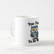 A clean white mug with a retro owl and humor for tired mornings.