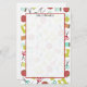 Papier de papeterie comportant une conception orientée de couture se composant d'une machine à coudre, des bobines de fil, d'un coussin de goupille, des ciseaux, des échantillons de tissu, et des aiguilles de couture. La conception a un rétro modèle de couleurs rouge, jaune, orange, bleu, et de turquoise.