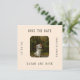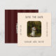 This retro-inspired save the date card features a warm neutral background paired with a rich burgundy accent for a timeless and stylish look. The centered photo layout adds a personal touch, making it perfect for couples who want to showcase their favorite moment.