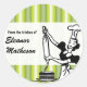 Illustration vintage d'un boulanger sur fond rayé vert tonal forme la base visuelle de ce mignon autocollant. Utilisez l'expression "De la cuisine de" ou faites-la vous-même et ajoutez votre nom (ou celui d'une autre personne). Inscrivez ci-dessous votre nom de plat. Disponible dans d'autres modèles et combinaisons de couleurs.