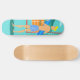 Chaque jour peut être une journée à la plage avec ce Retro Surfer Dude Skateboard. Le style des années 1960, minimaliste design d'art, est doté d'un mec surfeur baisé au soleil, blond et prêt à attraper une vague. Notre surfeur en forme regarde l'océan à travers les portes coulissantes en verre de sa maison en bord de plage. Il se tient dans son salon couleur aqua. Nous pouvons voir un aqua et turquoise, mur en pierre et fauteuil orange moderne du milieu du siècle. De l'autre côté de la porte vitrée, on aperçoit un patio. Au-delà se trouve une plage de sable doré, un palmier balançant, un océan bleu paon étincelant et un ciel d'aqua. Au loin, on peut voir une île volcanique turquoise, qui est dormante pour le moment. Surfer Dude tient une planche de surf bleue et porte des shorts de planche à motifs de tiki bleu. Attrapez quelques vagues et partagez un peu d'amour avec ce design d'été kitsch!