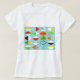 Ce rétro T-shirt de motif de harlequin est style moderne de la moitié du siècle à son plus fin. Les caractéristiques de conception inspirées vintages qu'un arrière - plan d'aqua avec des rangées des formes triangulaires formant un harlequin modèlent. Les formes deux-modifiées la tonalité de diamant sont jaunes, blanches, rouges, oranges, noires, vertes, et blanc avec des accents noirs. Mais l'attente, là est plus ! Il y a également des ovales oranges, des ovales verts avec les starbursts noirs, et des contours des diamants noirs. Le temps marche dessus, mais vous vous sentirez comme vous avez trouvé un souffle kitschy du passé avec ce trésor géométrique coloré.