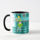 Avec cette rétro tasse de cuisine, vous pouvez prendre votre tarte et le manger, aussi. Ce dessin kitschy et minimaliste d'art comporte une femme au foyer parfaite des années 1950, dans sa cuisine moderne de la moitié du siècle. Le beau boulanger porte un flouncy, la robe de vert et un tablier blanc avec détailler rouge. Pas des cheveux sur sa tête blonde sont hors d'endroit. Dans une main, elle tient le fruit de son travail--un magnifique, trellis a complété, tarte de fruit. Un regard et vous saurez que ses pâtes à tarte floconneuses sont en second lieu à aucun. Elle se tient sur un plancher de damier d'aqua et de sarcelle d'hiver, dont est assurément assez propre pour manger. Contre un mur d'aqua, nous voyons le cabinetry turquoise avec le travail d'équilibre d'aqua, une partie supérieure du comptoir rouge, des tractions rouges de tiroir, et des accents noirs de starburst. Un rouge, horloge de starburst accroche sur le mur. Au côté, il y a un réfrigérateur de pointe et blanc avec les poignées argentées. Au moins, le réfrigérateur était la situation actuelle in 1950. Maintenant, il est juste rêveur simple ! Si vous êtes ménagère de Suzie ou avez simplement une affinité pour tout le cru de choses, vous êtes sûrs d'aimer cette tranche délicieuse d'americana.