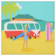 Chaque jour peut être un jour à la plage avec ce rétro tissu de couples de surfer. Le style des années 1960, caractéristiques de conception minimalistes d'art un amusement-affectueux, exposent au soleil adorer, couple de recherche de frisson tout prêt à attraper une vague. L'arrangement est une oasis tropicale, d'île avec une plage du sable d'or, un balancement, des palmiers verts, un scintillement, océan de bleu de paon, et un ciel d'aqua. Dans la distance, nous pouvons voir une île volcanique turquoise, qui est dormante pour l'instant. De retour sur la plage, nous ne pouvons nous empêcher de noter le tour doux qui a apporté nos couples à leur destination rêveuse. C'est un fourgon moderne, rouge et blanc de la moitié du siècle avec une planche de surf orange et jaune attachée jusqu'au dessus. Bien que nous ne puissions pas être sûrs, il est juste pour supposer que l'intérieur du fourgon comporte super, pose de tapis de tapis à longs poils et l'odeur de l'encens ! Le type de surfer et le bébé de plage font soleil-embrasser l'assortiment se bronze, les cheveux soleil-blanchis, et le bleu, les maillots de bain modelés par tiki. Le type de surfer tient une planche de surf bleue. Le bébé de plage se tient près de elle deux-a modifié la tonalité, planche de surf rose. Se trouvant tout près, il y a un ballon de plage rouge et blanc, attendant pour accomplir son destin d'été. Attrapez quelques vagues et partagez un certain amour avec cette conception kitschy d'été !