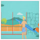 Chaque jour peut être un jour à la plage avec ce rétro tissu de type de surfer. Le style des années 1960, caractéristiques de conception minimalistes d'art soleil-embrassé, blond, type de surfer tout prêt à attraper une vague. Notre surfer d'ajustement regarde fixement sur l'océan par les portes en verre de glissement de sa maison du front de mer. Il se tient dans son salon coloré par aqua. Nous pouvons voir un aqua et une turquoise, le mur en pierre et la moitié du siècle modernes, chaise orange. Du bord opposé de la porte en verre, nous pouvons voir un patio. Au delà de cela, il y a une plage d'or et sablonneuse, un palmier de balancement, un scintillement, un océan de bleu de paon, et un ciel d'aqua. Dans la distance, nous pouvons voir une île volcanique turquoise, qui est dormante pour l'instant. Le type de surfer tient une planche de surf bleue et un bleu de port, des shorts de conseil modelés par tiki. Attrapez quelques vagues et partagez un certain amour avec cette conception kitschy d'été !