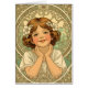 Illustration art nouveau d'une enfant avec des fleurs blanches dans les cheveux, dans un cadre ornementé de rinceaux