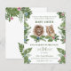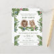 Une invitation de fête de révélation du sexe du bébé à petit budget. Sur fond blanc, une image aquarelle d'un lion et d'une lionne entourés de feuillage tropical vert de la jungle et de fleurs bleues et blanches est affichée. Le texte indique Bébé Votre Nom, Roi ou Reine de la jungle ? Personnalisez en ajoutant tous les détails de l'événement et les coordonnées.