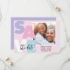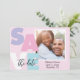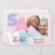 Des teintes pastel douces se combinent pour une carte "Save the date" moderne et romantique pour le printemps. Le devant de la carte présente la photo du couple entourée d'un cadre blanc. Le texte "the date" est posé sur "SAVE" en texte script noir. Le dos de la carte est un fond uni, violet clair, vide.