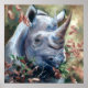 An original oil painting by Brenda Thour of a portrait of a rhinoceros with an abstract leafy background in greens and browns. Photo reference by Dr. Thomas Trainer. Copyright by Brenda Thour 2008.