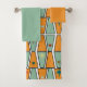 This towel set has a mid-century modern design of rhombuses repeating across the design, with some having starbursts. The wash cloths are orange while the hand towel is seafoam. If you like different colors, message me.