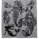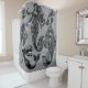 rideau de douche avec illustrations de sirènes en noir contre un arrière - plan gris avec bulles irisées.