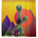 ravissant design géométrique et mixte média photo rideau de douche. Soleil, montagnes et plantes de cactus.