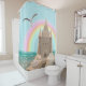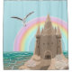 Une mouette plane au-dessus d'un pâté de sable avec l'arc-en-ciel !