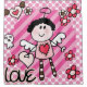 Rideau en douche mignon avec un chiffre de bâton ange, coeurs, fleurs, crâne, et texte qui lit l'amour sur un arrière - plan des rayures diagonales roses et du pois rose sur le blanc.