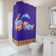 Un rideau de douche conçu avec une bordure empreinte de léopard de couleur orange exotique le long du fond. Illustré avec une aquarelle numérique d'un troupeau d'animaux sauvages qui courent ensemble. Les animaux comprennent un dauphin saut, une girafe, un éléphant, un kangourou, un rhinocéros, un lion et un léopard. L'arrière - plan est de couleur violette.