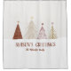 Un design élégant de rideau de douche pour salle de bain festive présente un affichage classe d'arbres de Noël enneigés en rouge, or et rose sur un fond beige crème neutre légèrement rayé de neige. La section inférieure est recouverte de neige blanche avec "Season's Greetings" en typographie classique élégante. Ajoutez un nom personnalisé ou une ligne de texte personnalisé en script rouge assorti avec le modèle simple à utiliser.