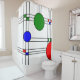 Ce rideau de douche est orné de vitraux art déco aux lignes noires et de carrés et cercles rouges, bleus et verts.