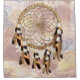 Un design d'attrape-rêves avec des garnitures dorées et marron qui comprend un cercle de bambou rond toile de vie avec des plumes de tons marron et des perles rouges sur un fond de plumes douces.
