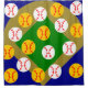 Ce rideau de douche a un thème de boule de conception d'un terrain de boule fait de diamants et demi-cercle, de boules de baseball et de boules douces faites de cercles avec fils.