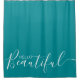 Ce rideau de douche présente un beau texte en blanc sur arrière - plan turquoise.