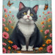Un chat noir et blanc aux yeux brillants est assis parmi des fleurs colorées, regardant deux papillons flotter à proximité. La scène est vibrante et sereine, avec une belle toile de fond bleu ciel.