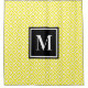 A white and yellow Greek key maze pattern with a black and white single letter monogram.