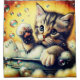Plongez dans le charme ludique de cette charmante oeuvre d'art avec un chaton profitant d'un bain à bulles. Le chaton, à l'expression somnolente, s'approche avec une patte au milieu de nombreuses bulles. L'arrière - plan chaleureux dégradé orange à jaune ajoute une atmosphère cosy et accueillante à la scène. Ce design fantaisiste capte le plaisir et la relaxation du temps du bain, le rendant parfait pour ajouter une touche de gentillesse et de chaleur à tout espace.