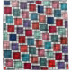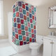 Ce rideau de douche a un design art déco de carrés faits d'angles superposés dans des tons rétro de bleu et rose.