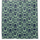 Ce rideau de douche a un design géométrique de cercles en rangs avec des cercles ou ovales à l'intérieur en bleu sur un champ de vert.