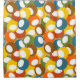 Ce rideau de spectacle a un design moderne du milieu du siècle de cercles en bleu, vert, marron, sienne, jaune et orange avec des ovales blanches à l'intérieur.