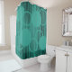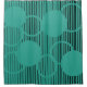 Ce rideau de douche a un design moderne du milieu du siècle de lignes verticales noires avec des cercles éparpillés sur un champ de turquoise.