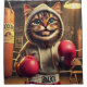 L'image montre un chat anthropomorphique dans un ring de boxe. Le chat porte un sweat - shirt à capuche gris avec le capuchon sur les oreilles et les gants de boxe rouge. Le gros sourire à l'aspect humain du chat est particulièrement frappant, donnant à l'image une expression humoristique, presque folle. L'arrière - plan montre un anneau de boxe classique avec des sacs perforants, des affiches et un éclairage tamisé, ce qui renforce l'atmosphère combative, mais drôle.