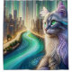 Cette superbe oeuvre d'art présente un chat aux traits saisissants et des motifs en fourrure dans les tons violet et bleu, regardant par une fenêtre haute. Les yeux verts vibrants du chat se détachent en regardant vers le paysage urbain animé ci-dessous. L'arrière - plan présente de hauts bâtiments le long d'un paysage fluvial sinueux qui reflète la lumière dans différentes teintes de vert et de bleu. Le contraste entre l'élégance naturelle du chat et l'environnement urbain stylisé crée une atmosphère captivante et sereine.
