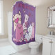 Un rideau de douche violet au texte rose qui lit Life's Better With Cats et présente beaucoup d'adorables chats de dessins animés, coeurs, et papillons dans les tons rose et lilas.