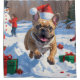 Un Bulldog français ludique court joyeusement à travers la scène hivernale enneigée, portant un casquette de Noël rouge festif. Ce design enchanteur met en valeur la robustesse de la race, son visage expressif et sa nature affectueuse tout en capturant la joie et la magie de la saison des fêtes. Un moment d'hiver gai plein de charme festif.
