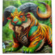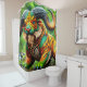 Ce rideau de douche a une créature imaginaire dessus.