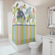 Les filles qui aiment les couleurs vives et les figurines en bâton mignonnes adoreront ce rideau de douche avec trois figurines en bâton, une avec un parapluie rose, des coeurs et des papillons, ainsi qu'une bordure supérieure de bleu turquoise clair et fond de rayures roses et blanches.
