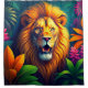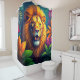 Ce rideau de douche a un design lion dessus.
