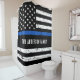 Rideau de douche mince en ligne bleue - Drapeau américain dans les couleurs du drapeau de la police, design en détresse. Personnalisez avec le nom de famille de la police. Ce rideau de douche de police personnalisé est parfait pour les familles policières et policières et tous ceux qui les soutiennent. DROIT D'AUTEUR © 2020 Judy Burrows, Black Dog Art - Tous droits réservés. Police à drapeau bleu clair personnalisé Douche rideau