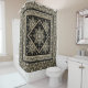 Ce rideau de douche Boho a des médaillons sépia sur le noir. Le noir, la crème et le bronzage dominent. Le design rappelle celui d'un tapis persan. Les images du médaillon proviennent d'un tuile artisanale du fabricant de tuiles de l'Oregon, Fay Jones Day.