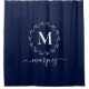 Ce rideau de douche personnalisé est élégant et élégant. Il dispose d'un arrière - plan bleu marine avec un délicat monogramme blanc de couronne botanique et une typographie en écriture blanche pour votre personnalisation.