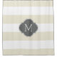 Elégant et tendance Ivory et White Striped Motif rideaux de douche avec monogramme personnalisé sur un badge en quatrefoil gris foncé. Motif chic.
