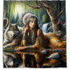Dans un cadre forestier paisible, une Indienne, ornée d'une tenue traditionnelle pleine de vie, repose paisiblement à côté d'un loup majestueux. Entouré d'une végétation luxuriante et d'une eau en cascade, le lien entre les deux reflète l'harmonie et le lien avec la nature.