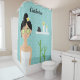 Ce rideau de douche présente l'illustration de Destei d'une belle femme spa. La femme a les cheveux noirs qui sont sur un petit pain et il y a une fleur frangipani blanc tropicale à côté du petit pain. La femme porte une serviette blanche sur son corps et elle a des rondelles de concombre sur ses yeux. A côté de la femme, une étagère blanche est agrémentée de pierres de massage et de deux bougies blanches. Sous l'étagère, il y a deux plantes en bambou vert qui apportent encore plus de spa au design. L'arrière - plan est un amusant motif de tuiles bleues turquoises. Il y a aussi une zone de texte personnalisable pour un nom.
