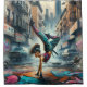 Le design montre une scène animée dans laquelle une danseuse de break se produit en pleine balançoire dans la rue. Le personnage principal, la danseuse de rupture, est au milieu d'un puissant support à main.
