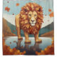 Leaves d'automne Lion mâle, ce design créatif présente un lion mâle entièrement fait de feuilles d'automne debout sur un lac avec une belle réflexion.