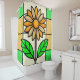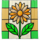un vitrail illustrant une marguerite jaune et blanche aux feuilles verts.